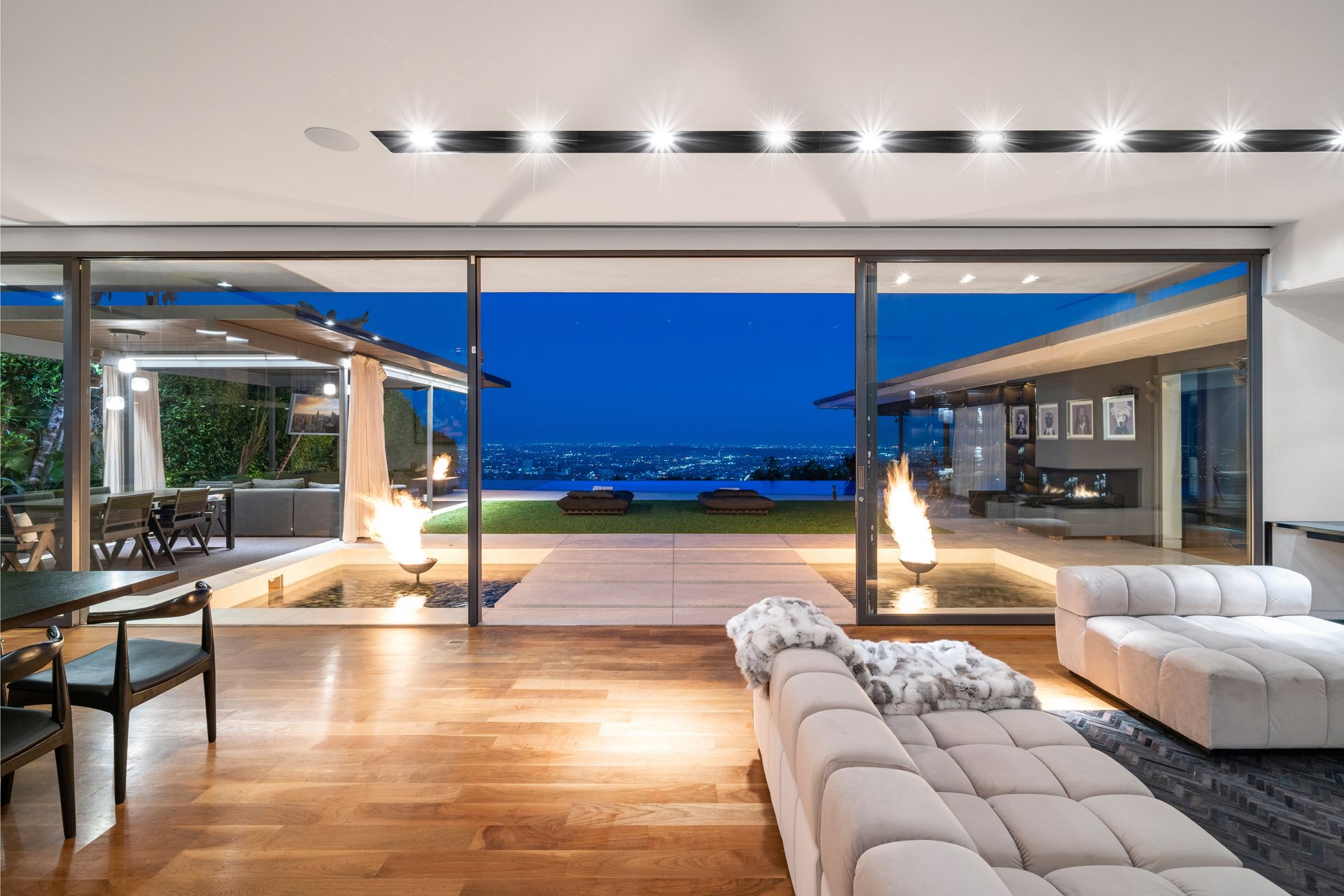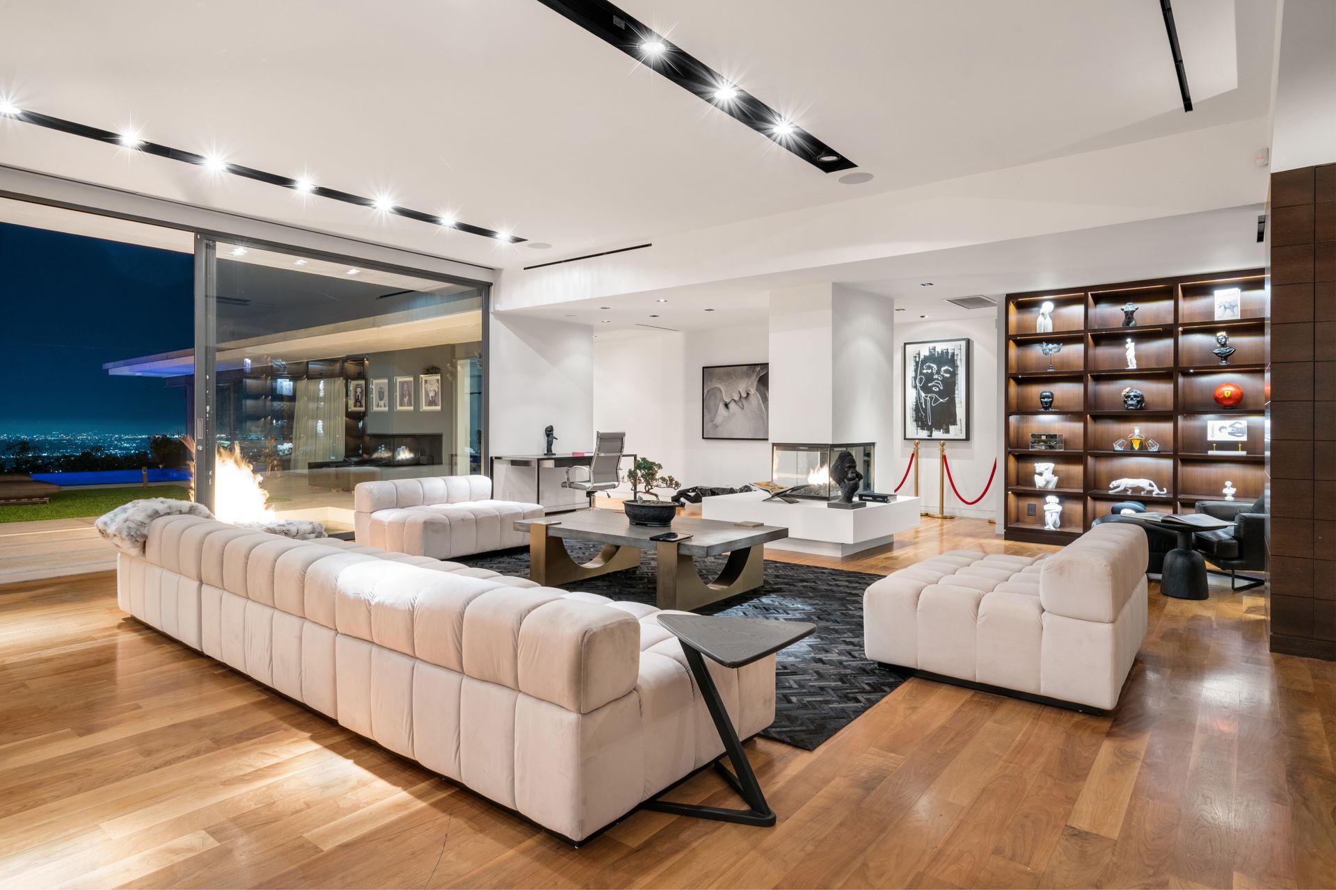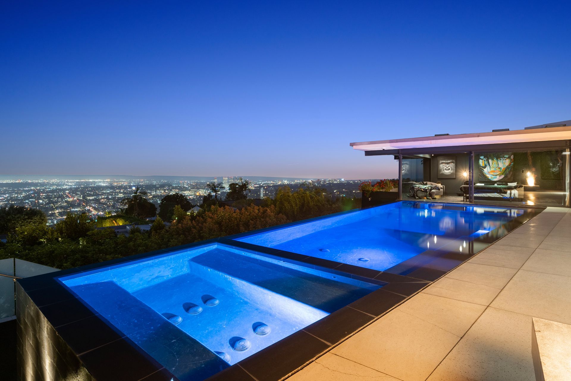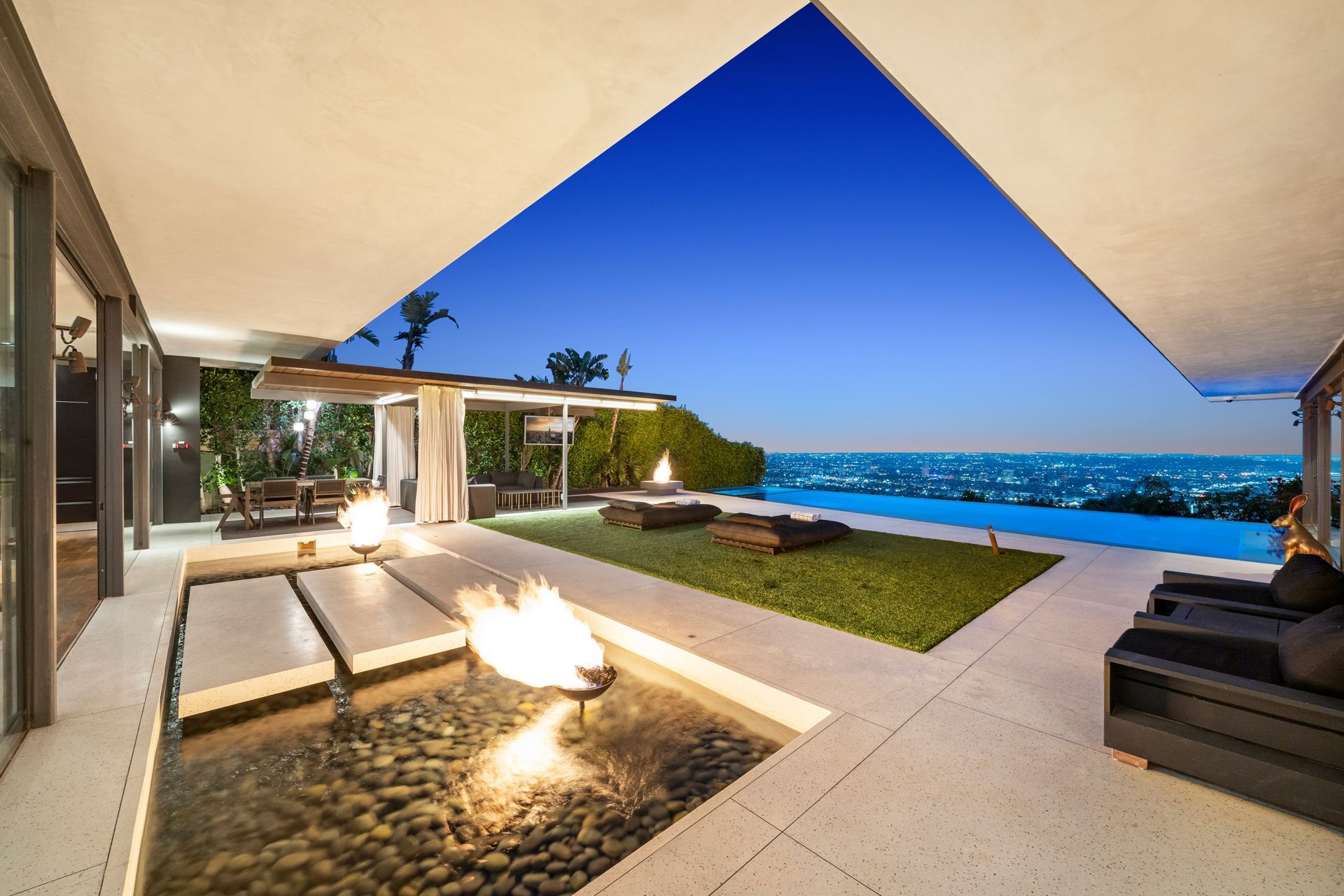 This elegant villa, located off Sunset Strip, presents unmatched architecture and stylish design. The focal point of the property is its stunning pool terrace, which boasts breathtaking city views and captivating fire pits. Additional luxurious amenities include a home theater, gym, and state-of-the-art furnishings and appliances.